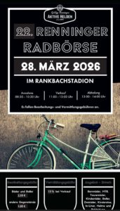 Am 28. Mär 2026 findet wieder die Radbörse im Rankbachstadion statt. Details entnehmen Sie bitte dem Flyer. Die AH Renningen freut sich auf Ihr kommen!