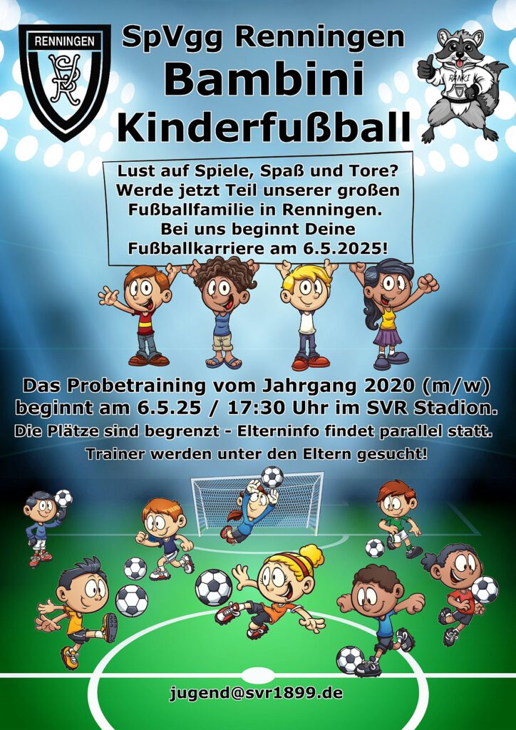 Bambini Jahrgang 2020 starten am 6.5.2025Lust die Fußballkarriere zu starten? Werde jetzt Teil unserer großen Fußballfamilie in Renningen. Wir laden alle Jungs und Mädchen des Jahrgangs 2020 herzlich ein, am 6.5.2025 um 17:30 Uhr im SVR-Stadion an ihrem ersten Bambini-Probetraining teilzunehmen. Noch jüngere Kinder müssen sich bitte ein weiteres Jahr gedulden, da die Gruppen jahrgangsbezogen […]