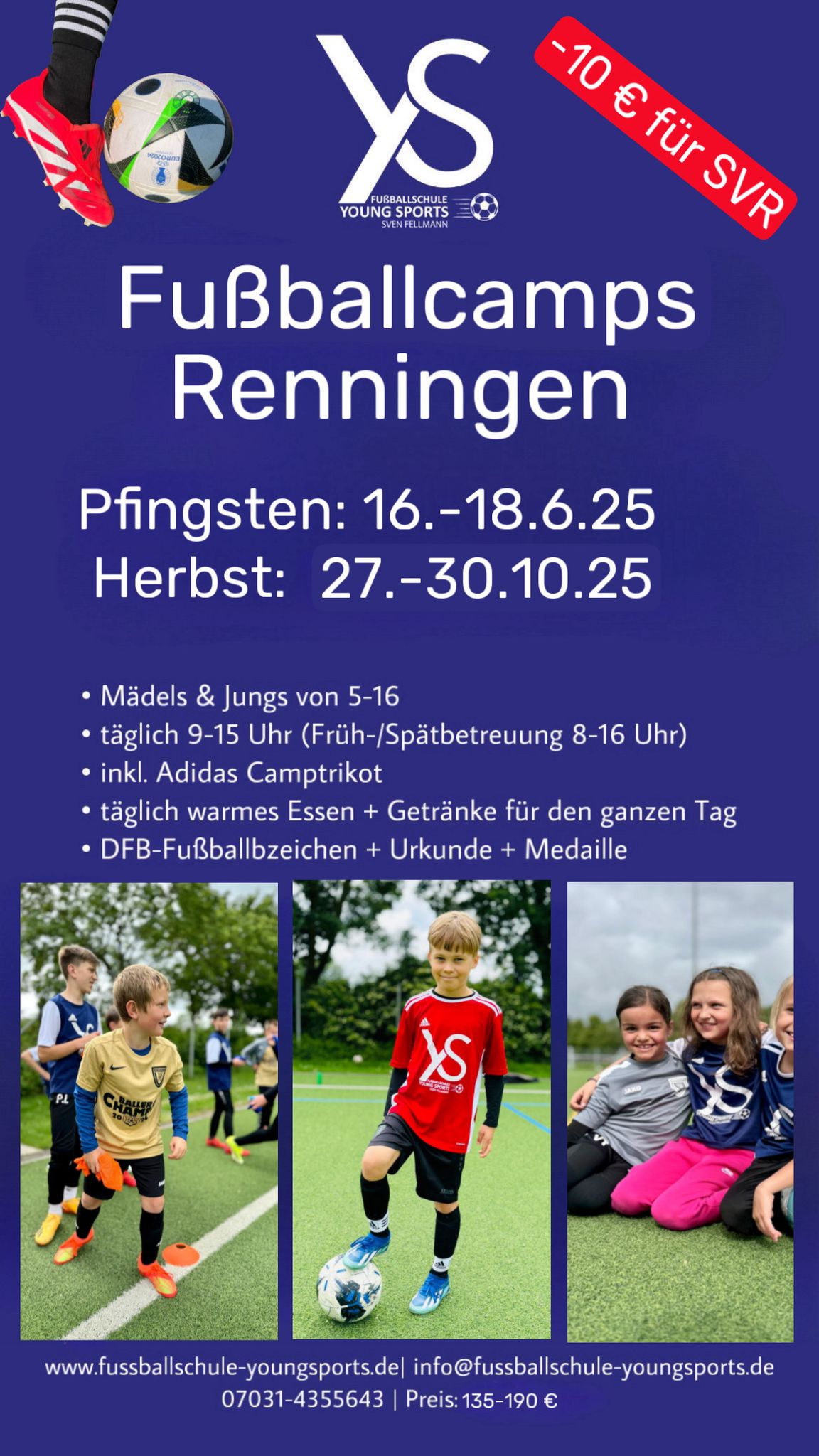 In den Fußballcamps von YOUNG SPORTS aus Sindelfingen erwartet Dich und Deine Freunde ein Profitraining von Lizenz-Trainern, vor allem aber viel Spaß bei Turnieren, Spielen und Torschussaktionen. Die Fussballschule von Sven Fellmann ist ca. zwei Mal im Jahr in Renningen zu Gast, veranstaltet aber eine Vielzahl von Camps in der näheren Umgebung.