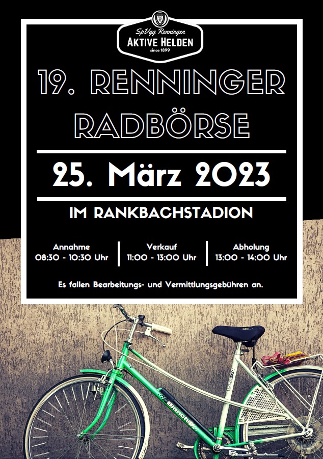 Die 20. Radbörse findet wieder im Rankbachstadion statt! Am 16. März begrüßen wir Euch ab 08:30 Uhr.Für Speis und Trank ist gesorgt. Wir freuen uns auf Euer kommen!