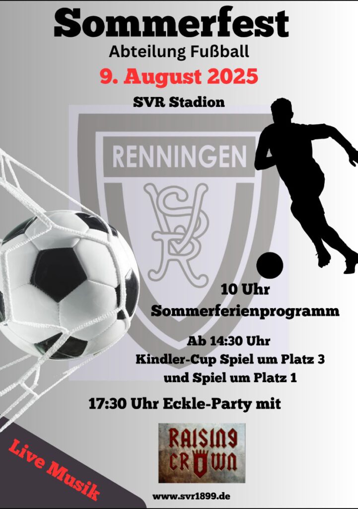 Vom 06.08.-09.08. findet im SVR-Stadion zum 9. Mal der Kindler-Cup statt, begleitet von unserem großen Sommerfest am Finaltag, Samstag den 09.08.25. Als Highlight tritt in diesem Jahr die Band „Raising Crown“ direkt nach der Siegerehrung auf.